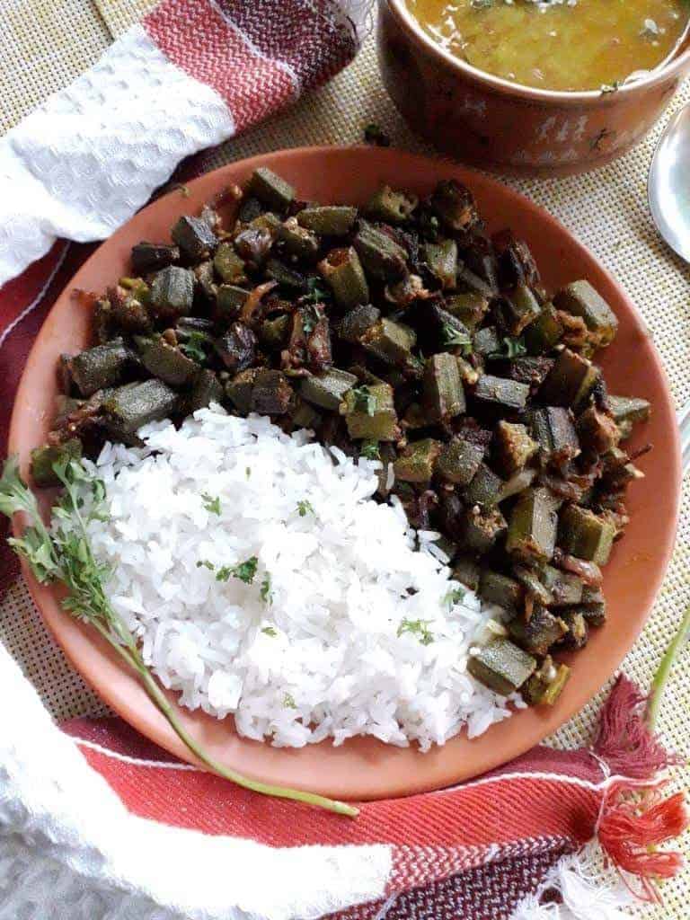 If you want to make something light for dinner, try this easy and quick Okra fry. It's fast, easy to make, and a simple dish to add to lunch or dinner. It pairs well with flatbreads (such as roti or paratha) as well as with dal rice. It's naturally gluten-free and vegan stir fry.