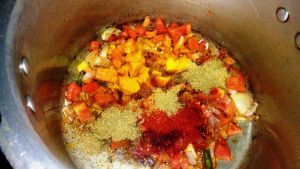 - Add chopped tomatoes. Saute for 2 minutes. Then add all spices except dry mango and mix well.